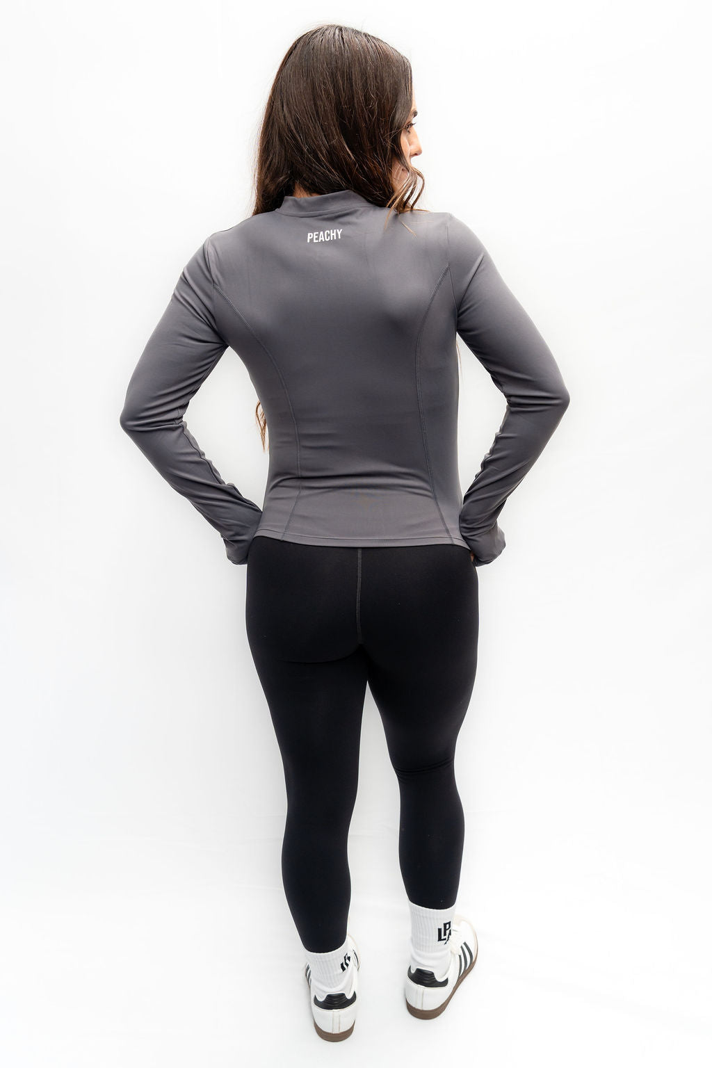 Designed with a cropped fit and finished with a small Peachy logo on the chest, it blends performance with effortless style—ideal for warm-ups, cool-downs, or everyday wear.